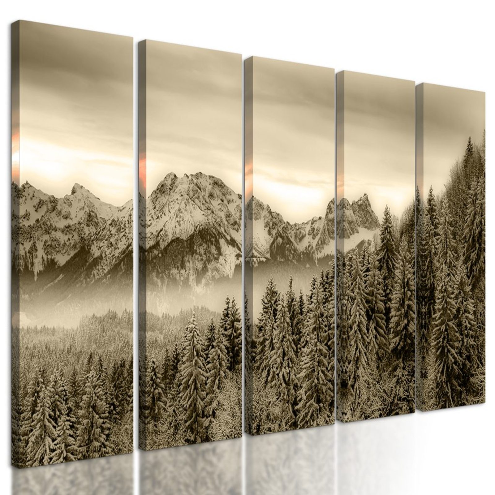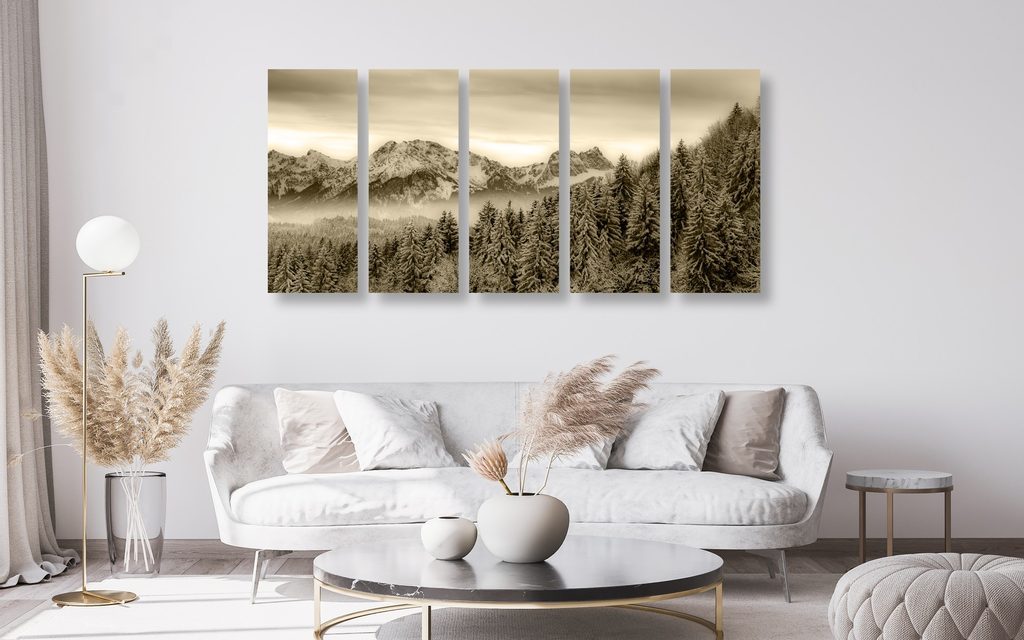 5 részes kép fekete-fehér hegy a reggeli ködben