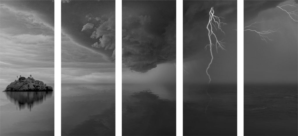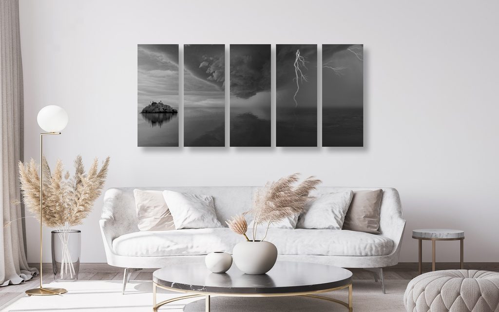 5 részes kép sziget felé zúduló vihar fekete-fehér kivitelben