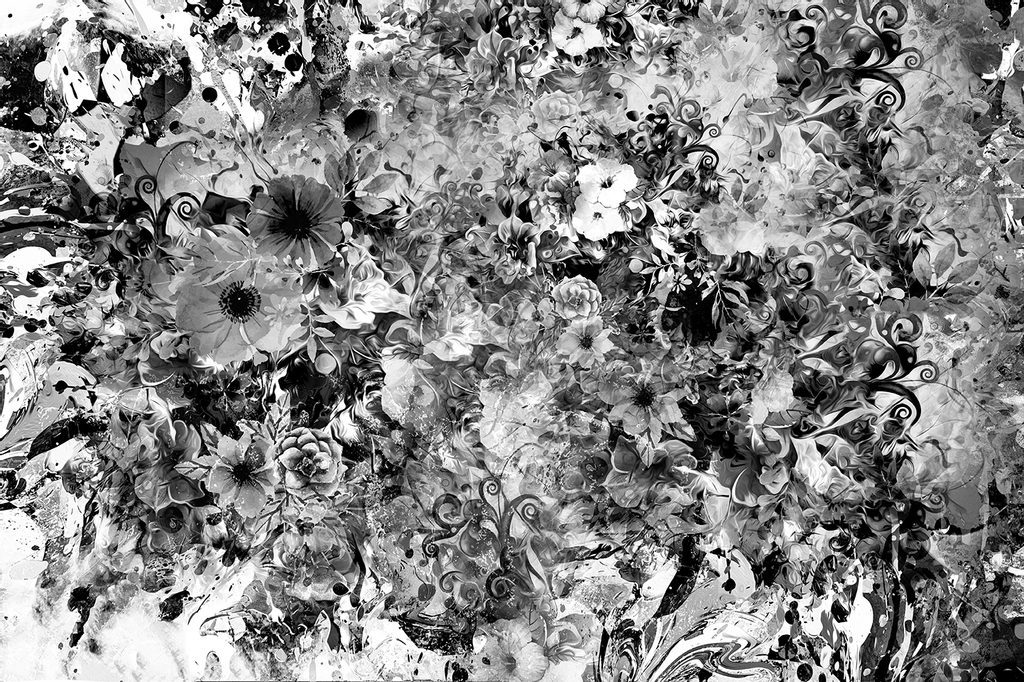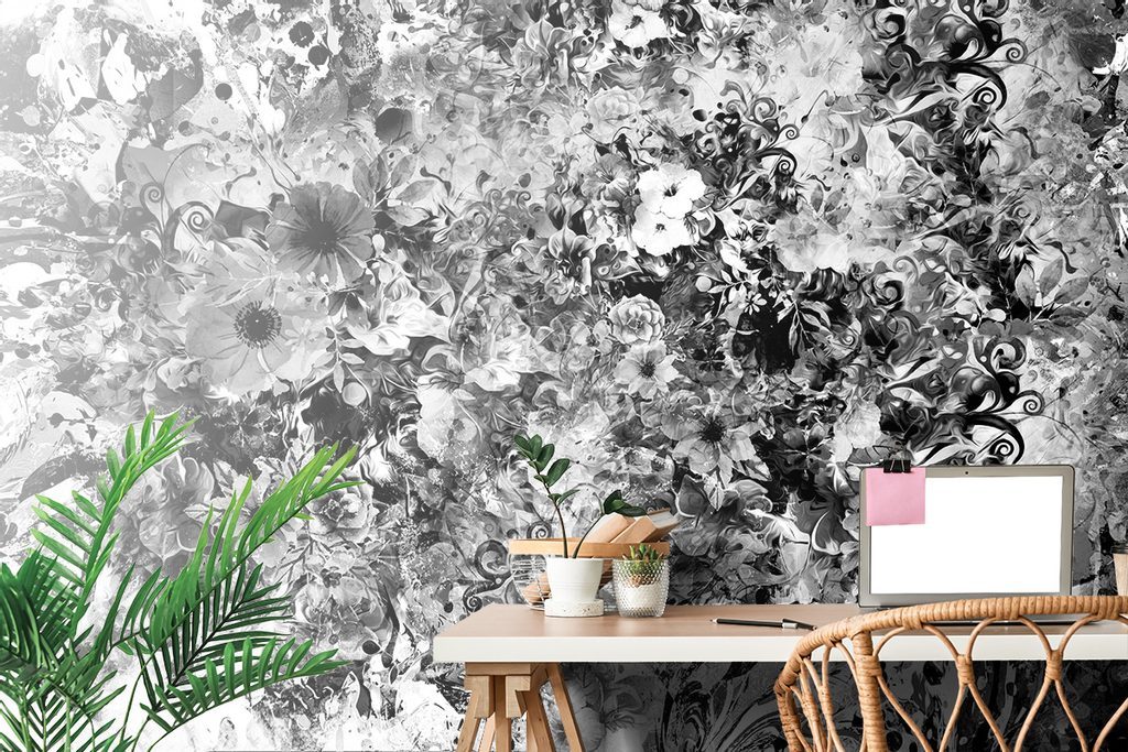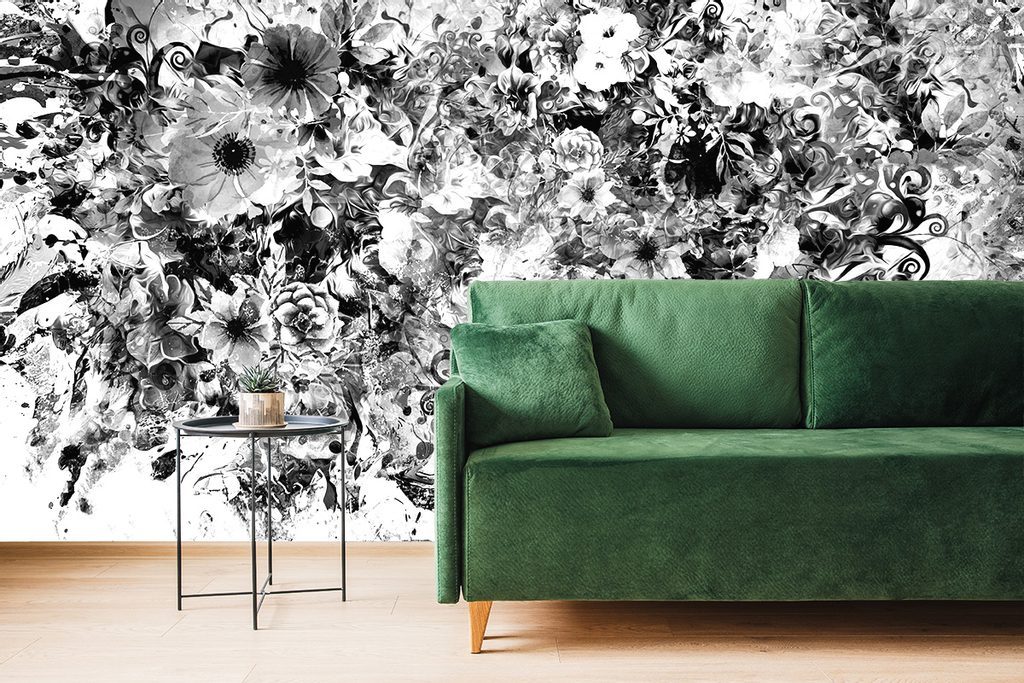 Érdekes öntapadó tapéta különféle virágok fekete-fehér kivitelben