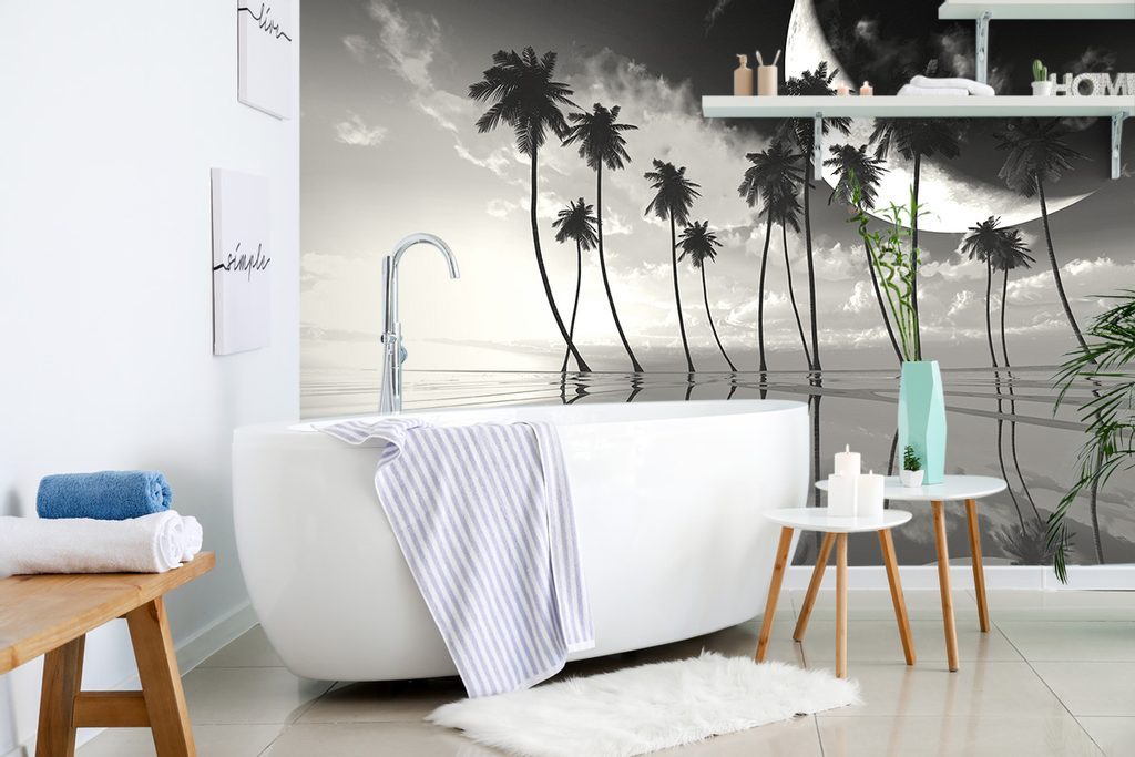 Fekete-fehér egzotikus pálmafák naplementekor öntapadó tapéta