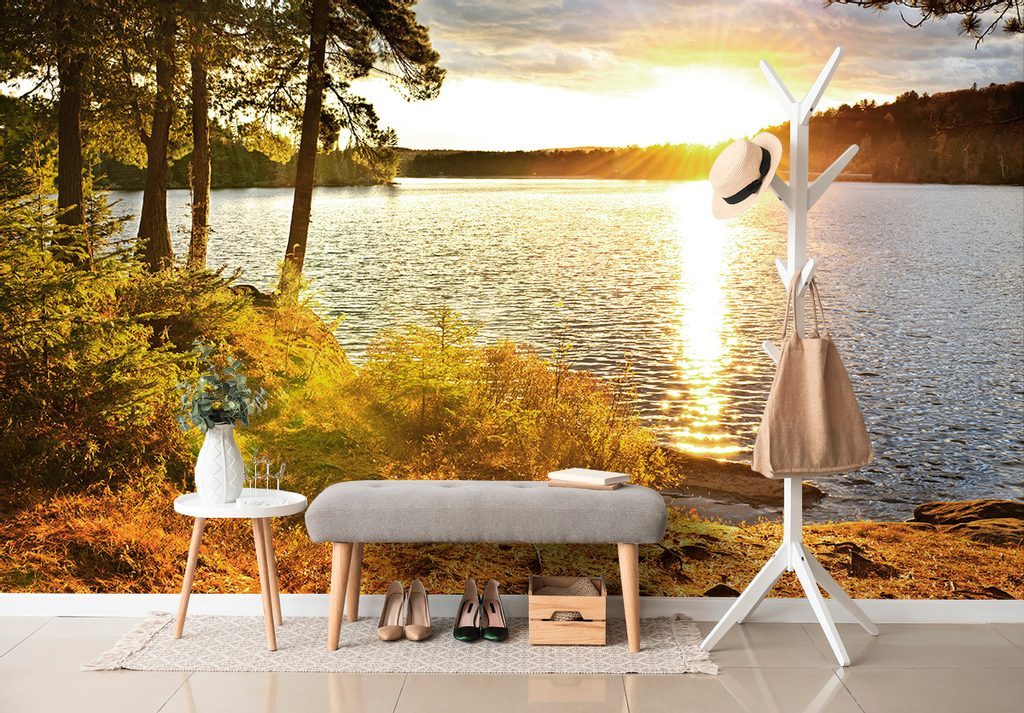 Fotótapéta a lenyugvó nap varázslatáról a tó mellett