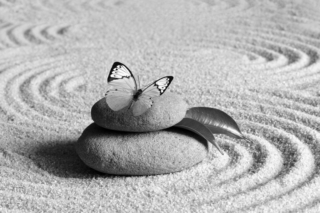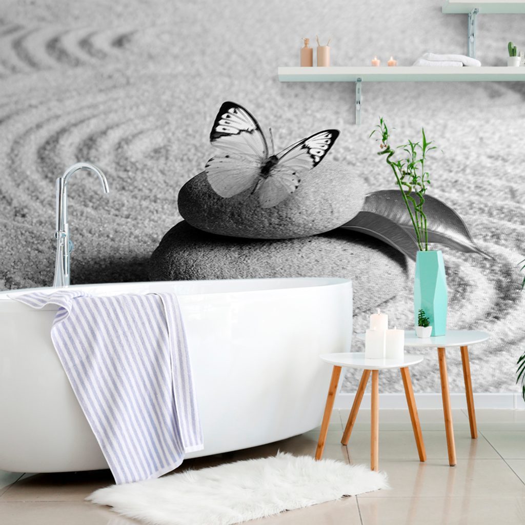 Fotótapéta gyönyörű pillangó a zen kertben fekete-fehérben