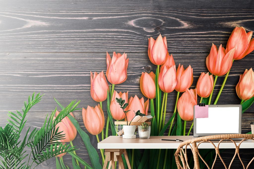 Fotótapéta narancssárga tulipánok fa háttéren