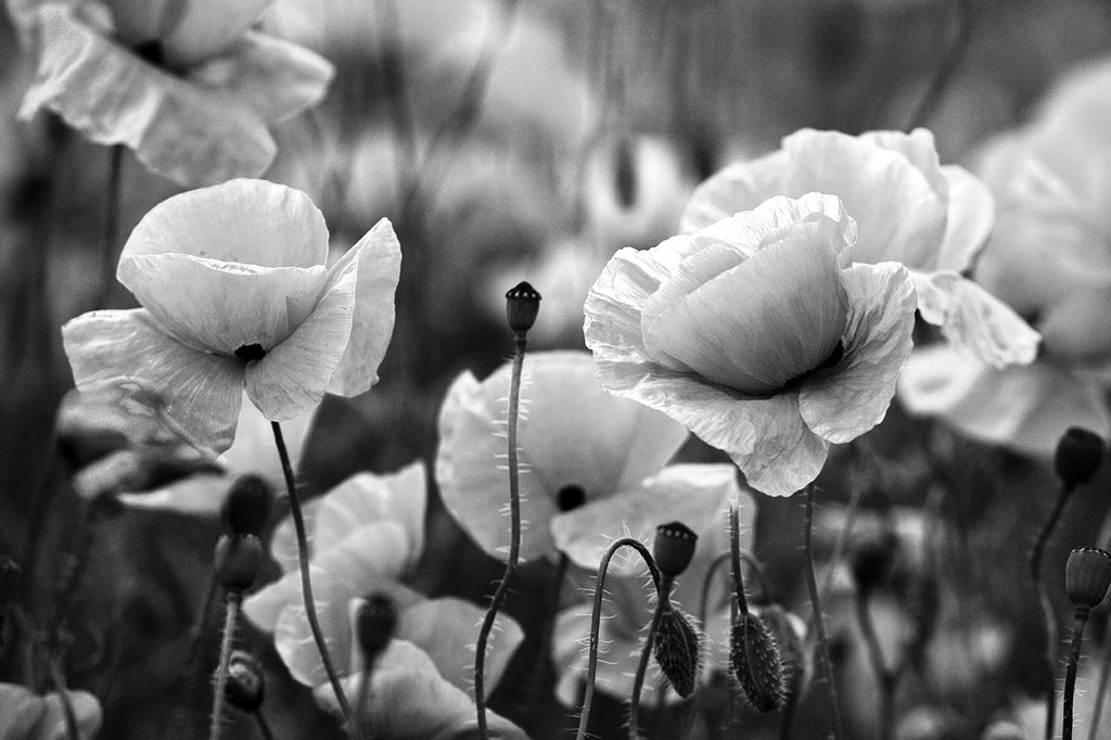 Gyönyörű fekete-fehér fotótapéta a pipacsok ölelésében