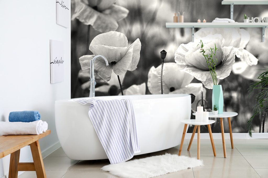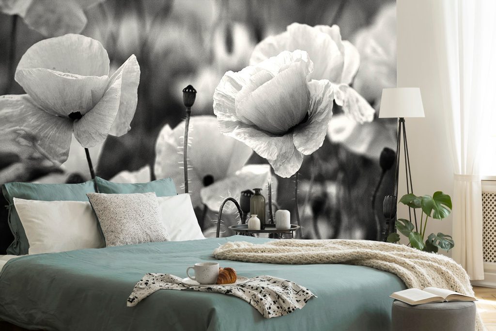 Gyönyörű fekete-fehér öntapadó fotótapéta a pipacsok ölelésében