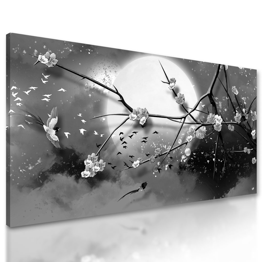 Kép repülő madárkák teliholdkor fekete-fehér kivitelben