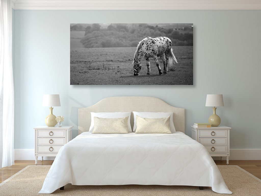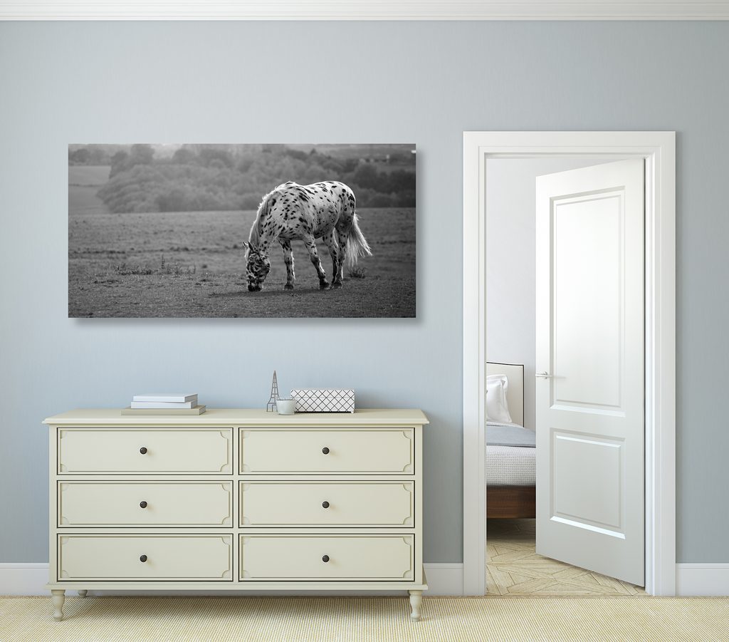 Kép réten legelésző gyönyörű ló fekete-fehér kivitelben
