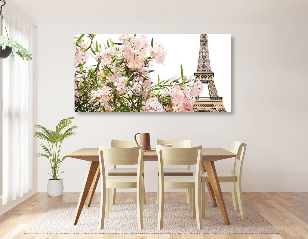 Kép rózsaszín virágok az Eiffel-torony alatt