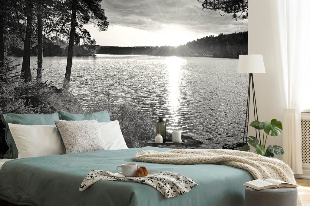Öntapadó fotótapéta fekete-fehér naplemente a tó mellett