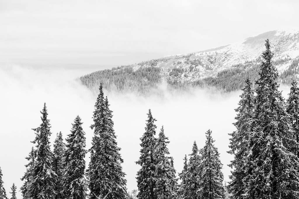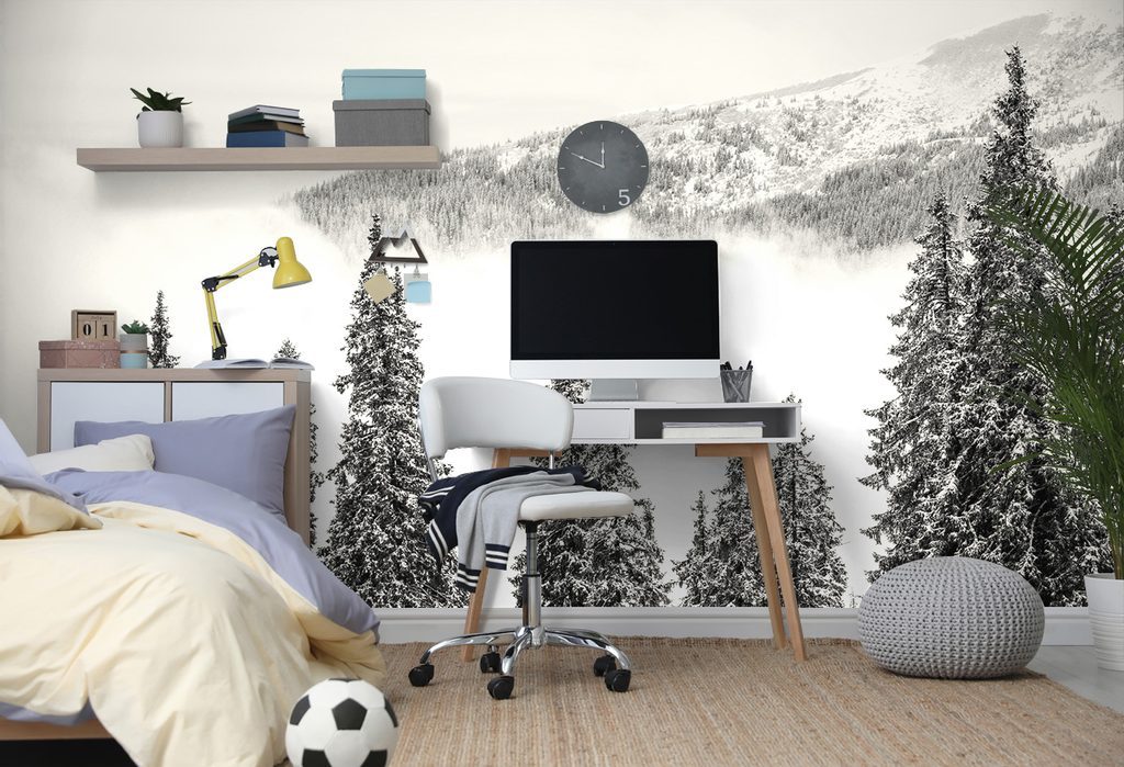 Öntapadó fotótapéta friss hóval borított fák fekete-fehérben
