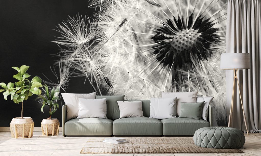 Öntapadó fotótapéta részletgazdag gyermekláncfű fekete-fehér kivitelben