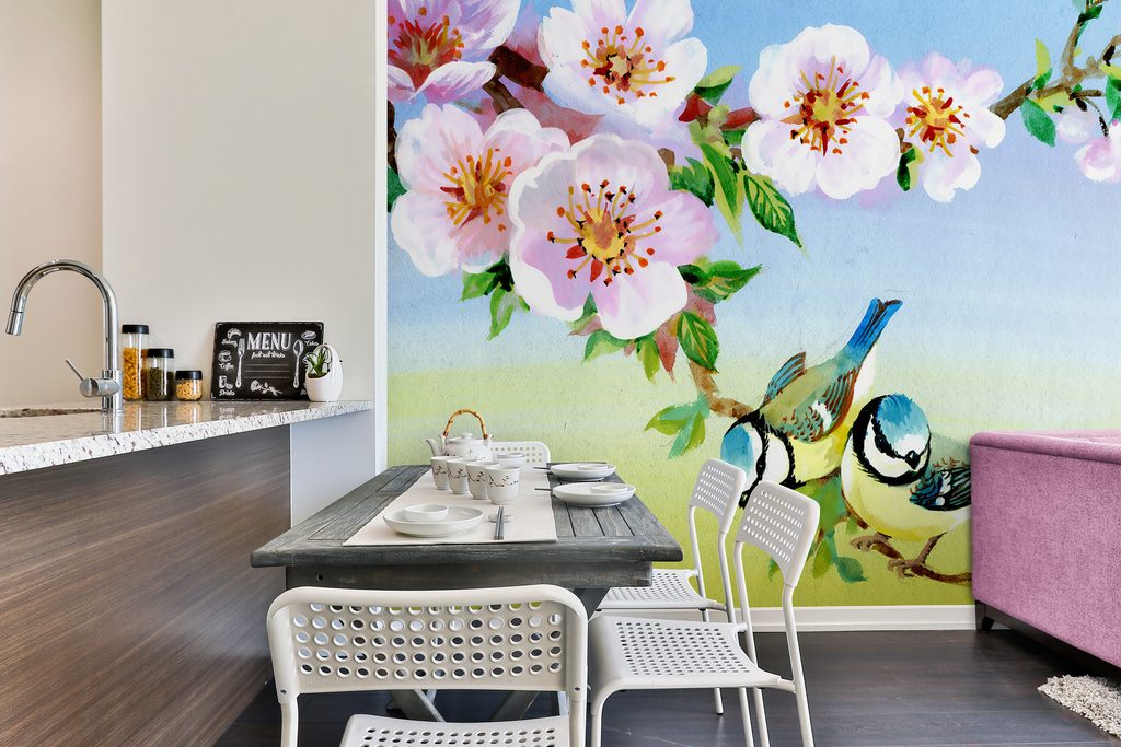 Öntapadó tapéta egy cinege ül egy ágon virágokkal