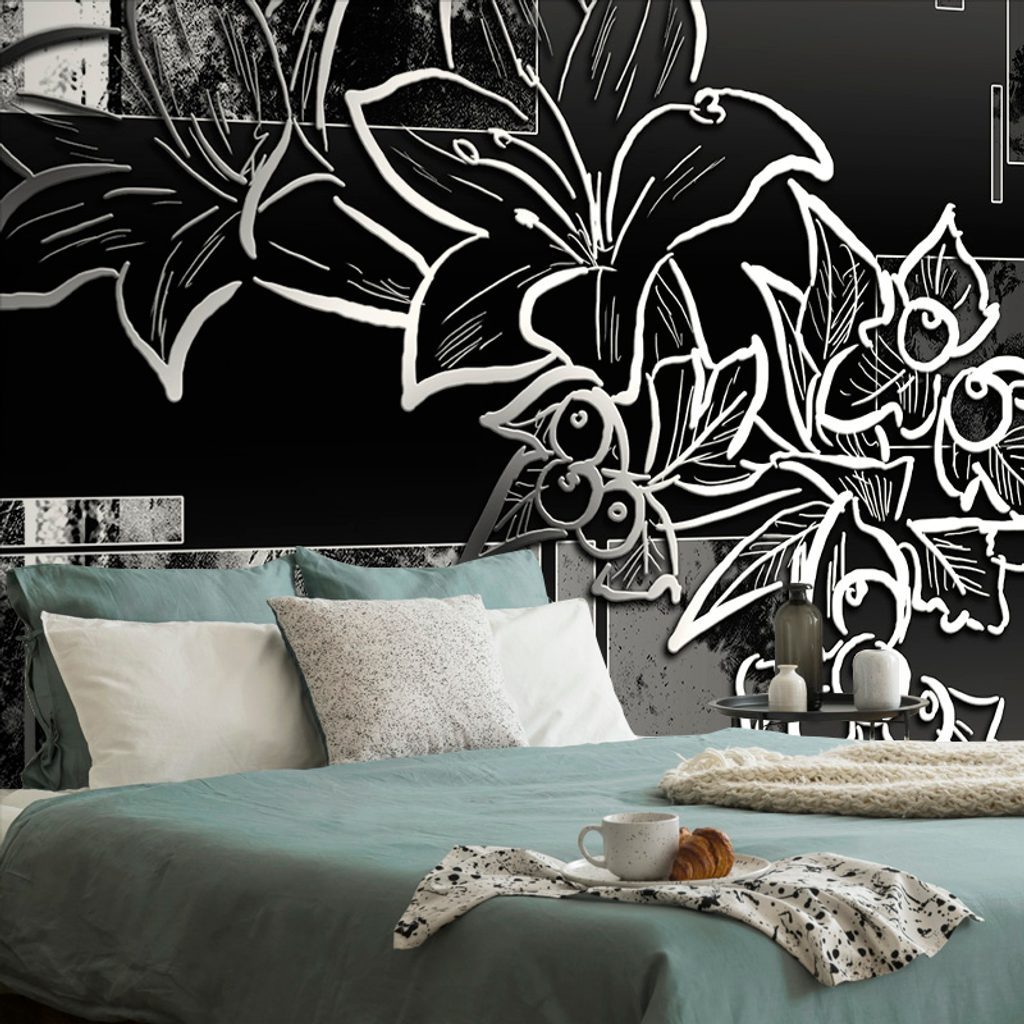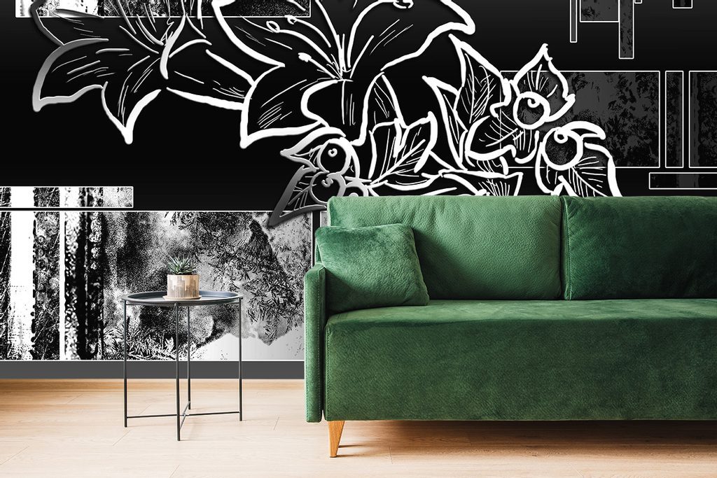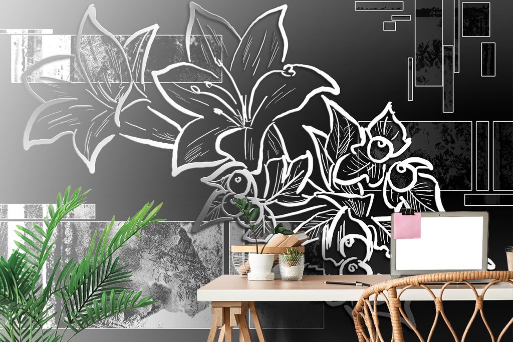 Öntapadó tapéta fekete-fehér rajz virágok egy absztrakt háttér