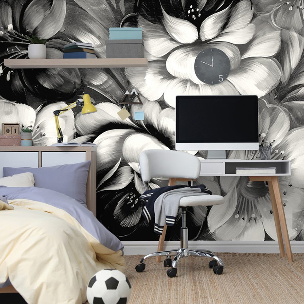 Öntapadó tapéta fekete-fehér virágok impresszionista stílusban