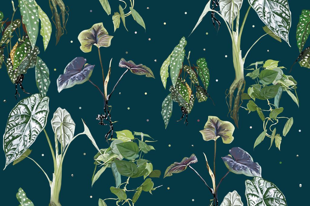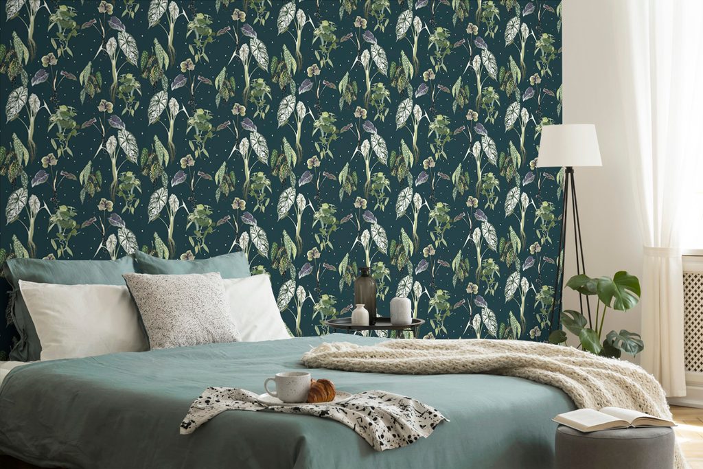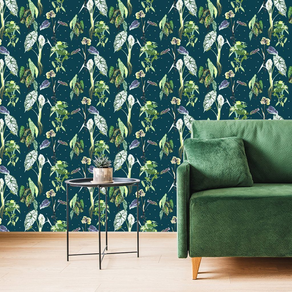 Öntapadó tapéta gyönyörű trópusi növények kék alapon