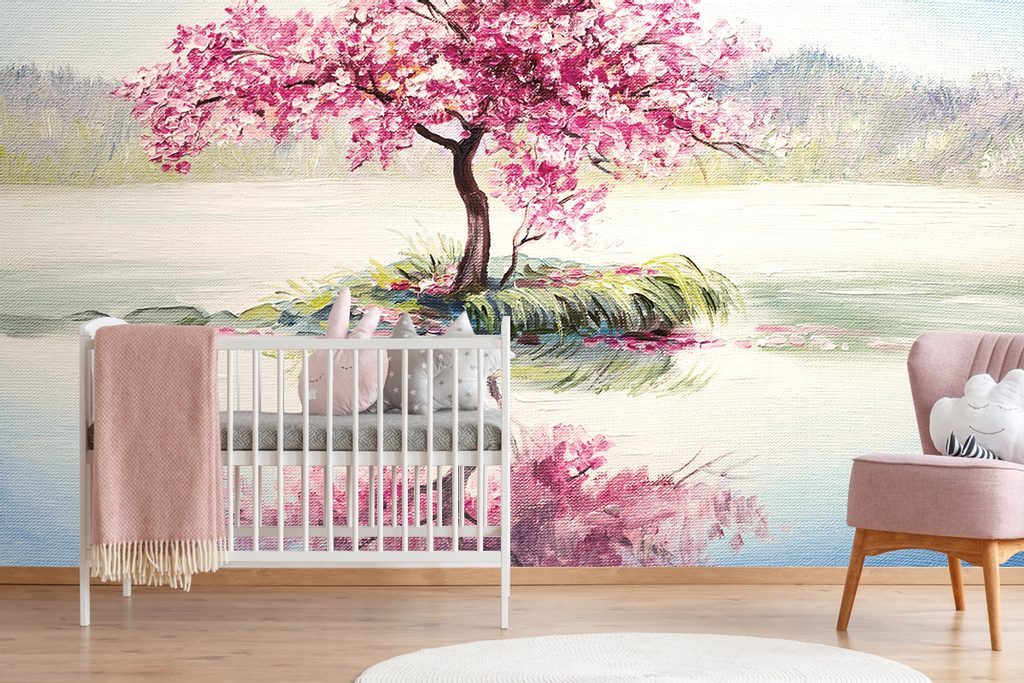 Öntapadó tapéta keleti cseresznye a tó ölelésében