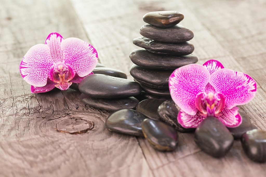 Öntapadó tapéta orchidea és Zen kövek egy fából készült háttéren