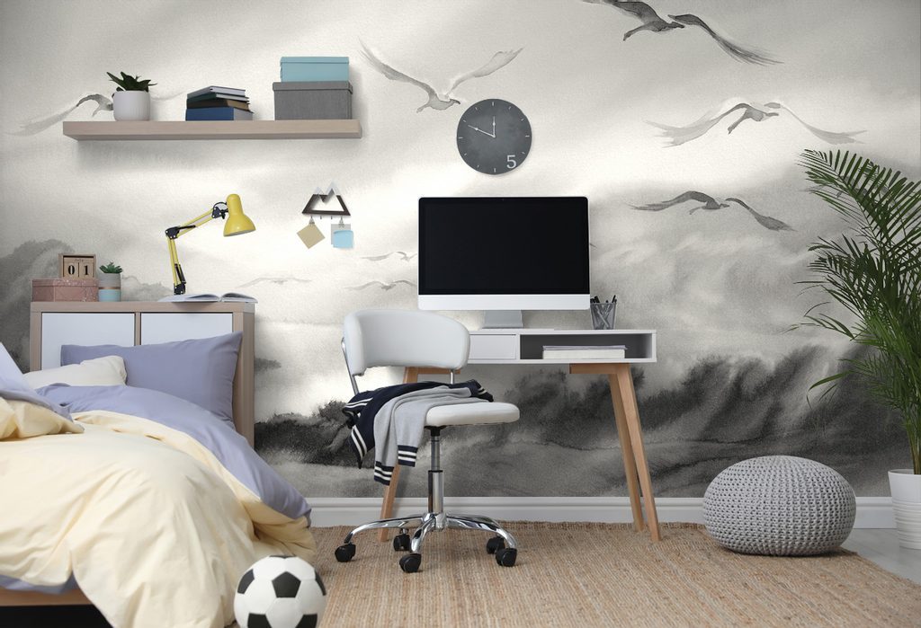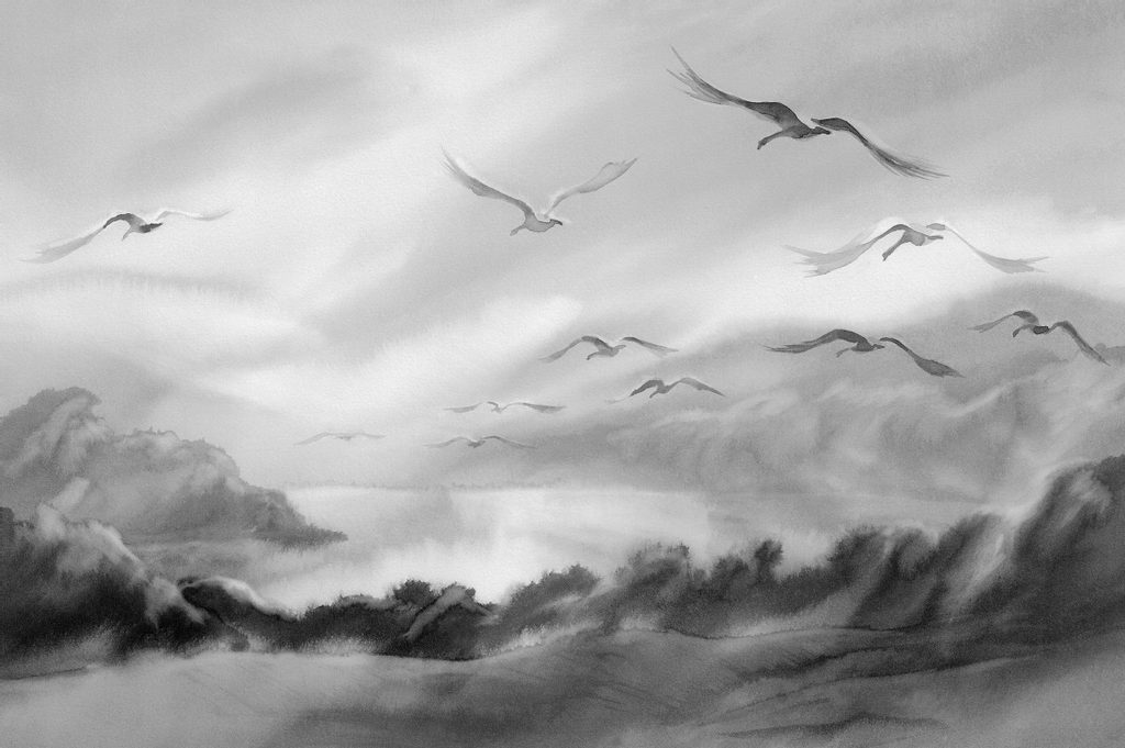 Öntapadó tapéta repülő madarak a tó felett fekete-fehér háttérkép