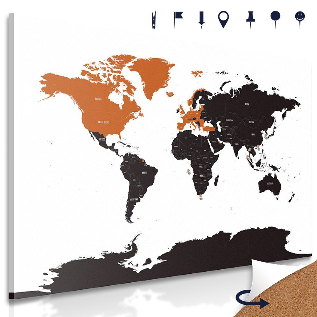 USP előnyök térképek parafán A kép tartalmaz 10 db gombostűt az ön választása szerint, Könnyű telepítés, Egészen 3 mm vastag parafa tábla, Változatos termékfelhasználás – ajándékként is alkalmas