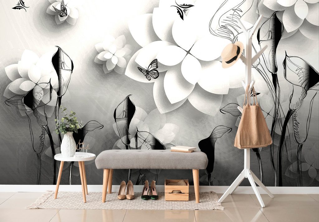 Tapéta érdekes absztrakt virágok fekete-fehér kivitelben