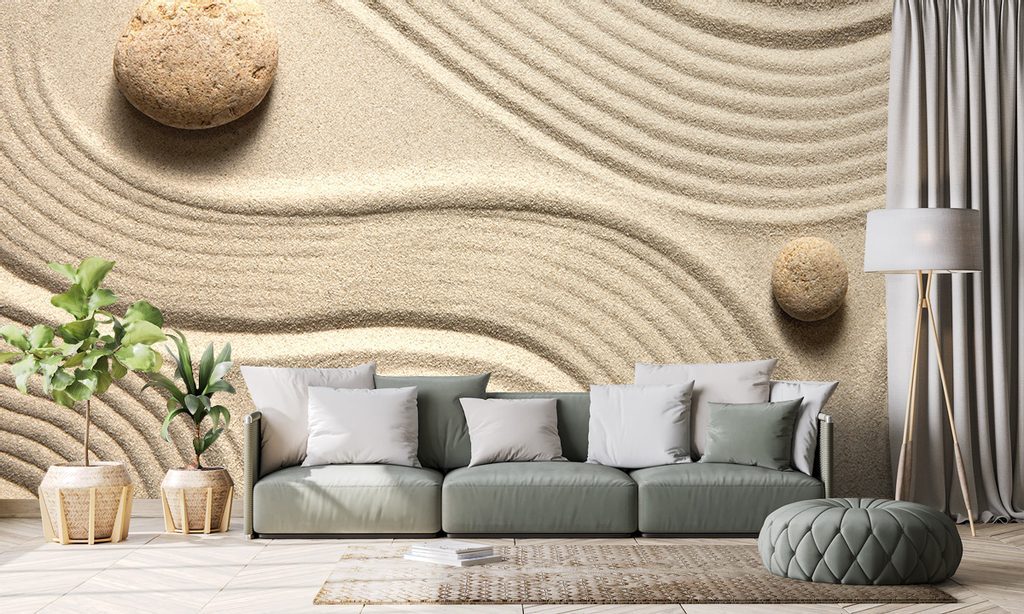 Fotótapéta fekete-fehér homokos körök zen kövekkel