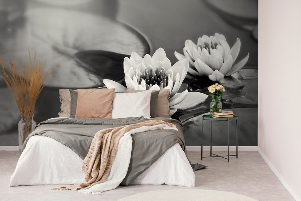 Tapéta lótuszvirág a tó felületén fekete-fehér kivitelben