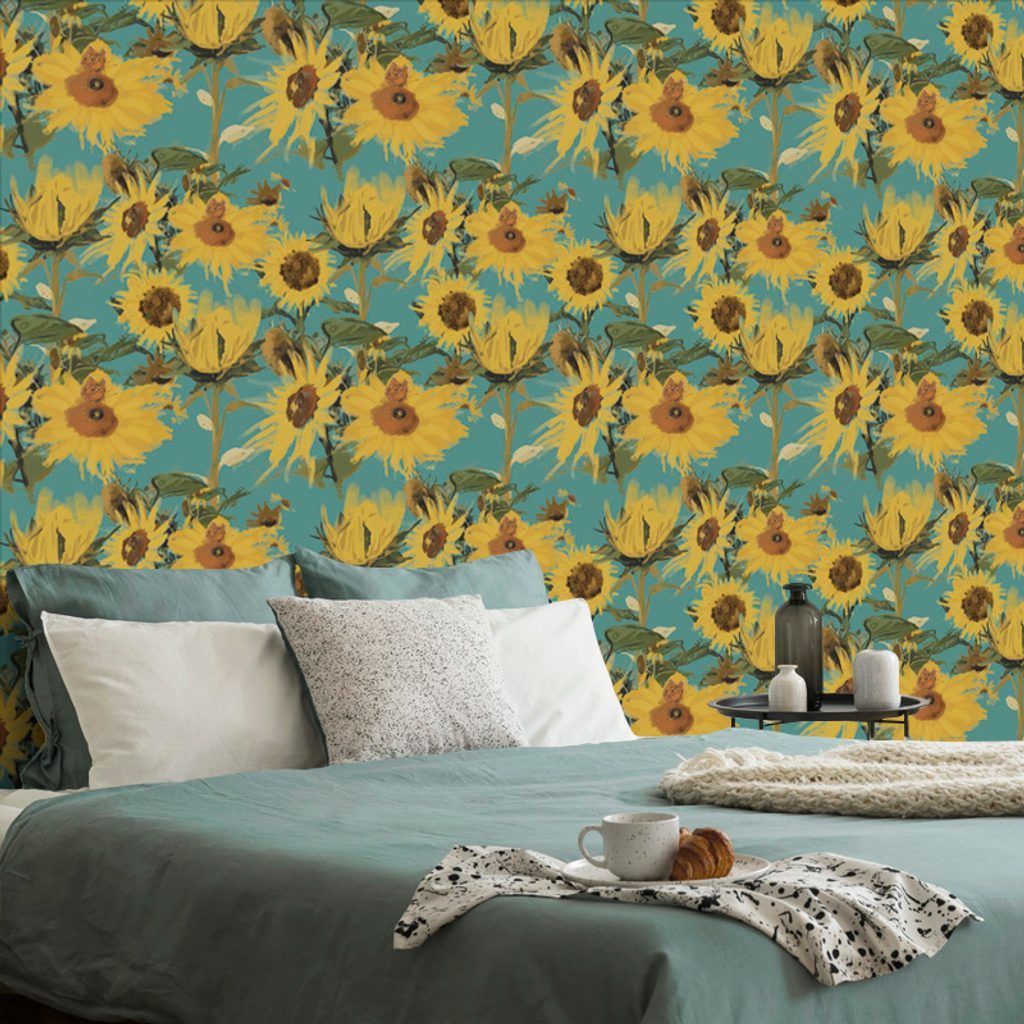 Tapéta virágzó napraforgó kék alapon